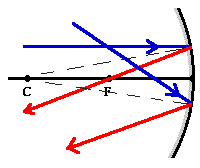 Light always follows the law of reflection, whether the reflection occurs off a curved surface or off a flat surface. The task of determining the direction in which an incident light ray would reflect involves determining the normal to the surface at the point of incidence. For a concave mirror, the normal at the point of incidence on the mirror surface is a line which extends through the center of curvature. Once the normal is drawn the angle of incidence can be measured and the reflected ray can be drawn with the same angle. This process is illustrated with two separate incident rays in the diagram at the right. Concave mirrors are capable of producing real images (as well as virtual images). When a real image is formed, it still appears to an observer as though light is diverging from the real image location.